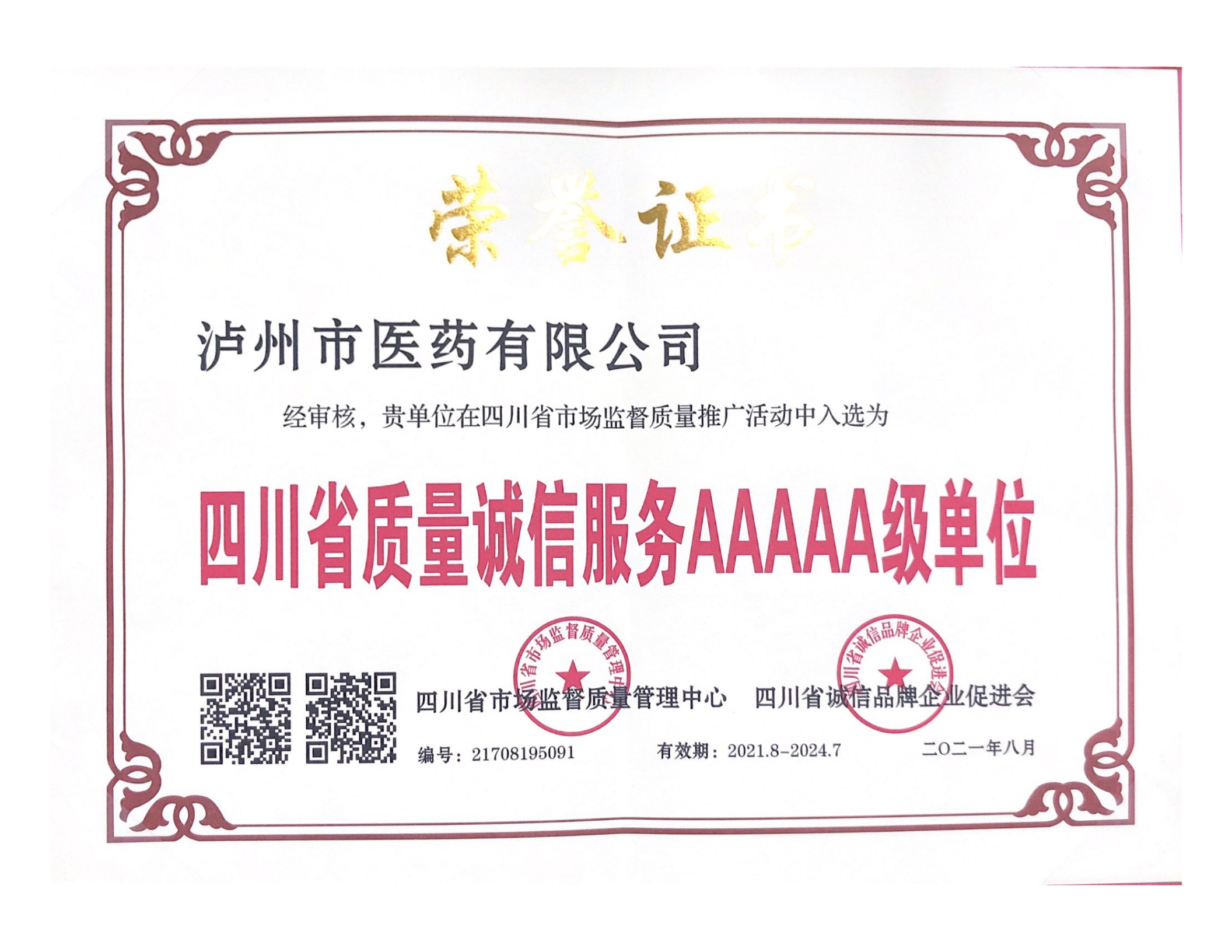 近日,泸州市医药有限公司在四川省市场监督质量推广活动中被四川省市场监督质量管理中心、四川省诚信品牌企业促进会评选为:“四川省质量诚信服务AAAAA级单位”和“四川省AAAAA级标杆优秀企业”。这是继“四川省质量信誉服务AAA单位”、“四川省质量信誉双优单位”、“3.15诚信经营优秀企业”、“3.15质量合格无投诉单位”后新的质量荣誉称号。