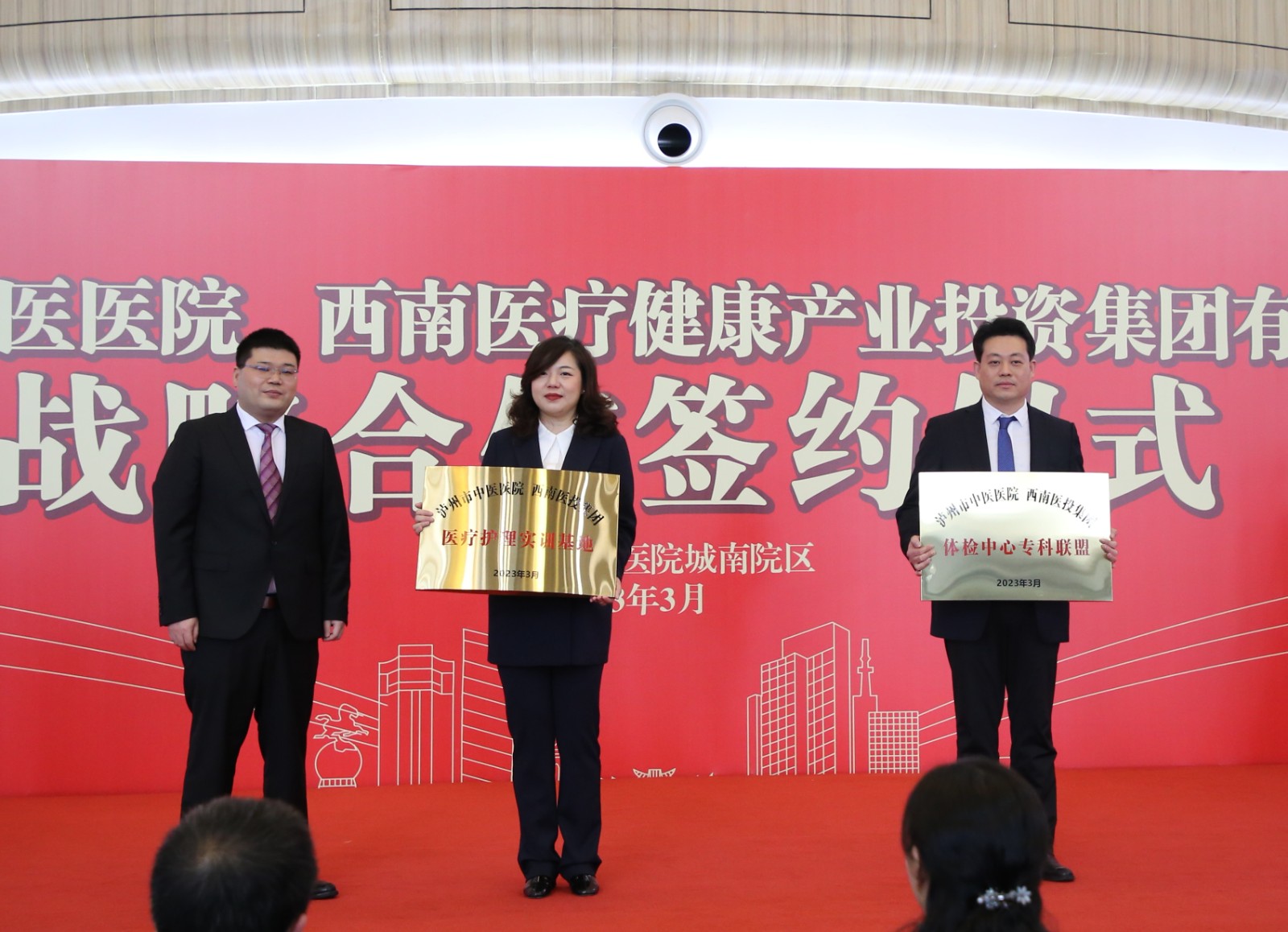 3月21日,西南医投集团与泸州市中医医院战略合作签约仪式在泸州市中医医院城南院区举行。泸州市副市长罗素平,市民政局副局长卓彬,市国资委专职党委副书记胡琳,市总工会机关党委书记周正国,市医保局副县级干部罗荣出席仪式。市卫生健康委副主任龙维平主持仪式。