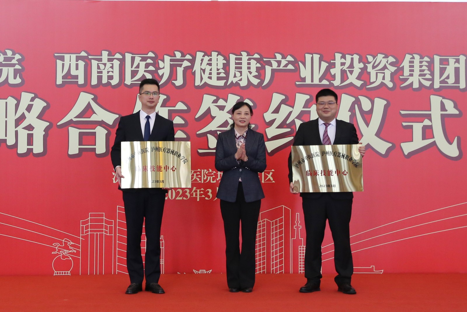 仪式上,双方签订了战略合作协议,对合作的泸州市中医医院·西南医投集团医疗护理实训基地、体检中心专科联盟,泸州市中医医院·泸州医疗器械职业学院临床技能中心进行了授牌。